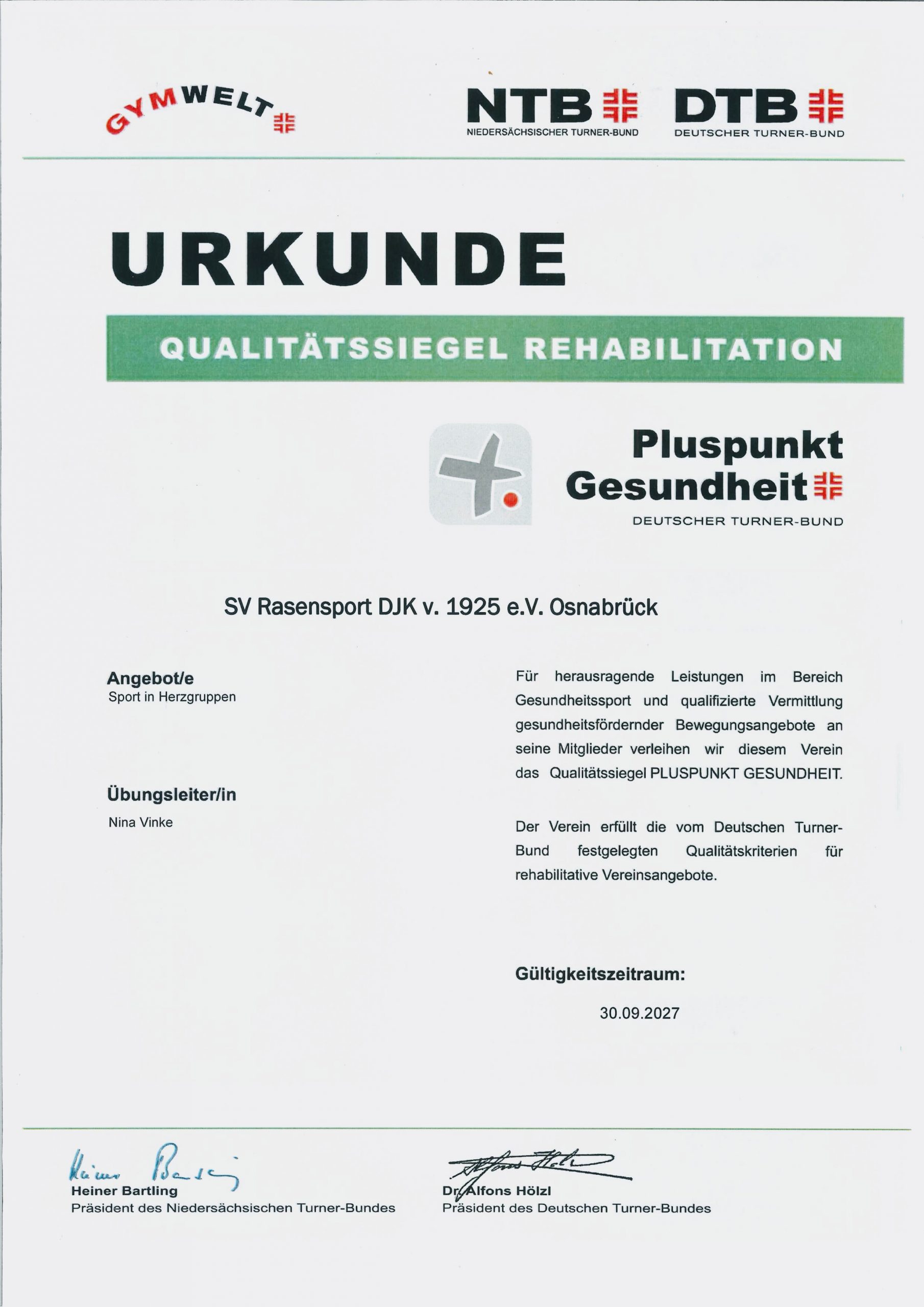 Der Verein erfüllt die vom Deutschen Turner-Bund festgelegten Qualitätskriterien für rehabilitative Vereinsangebote.
